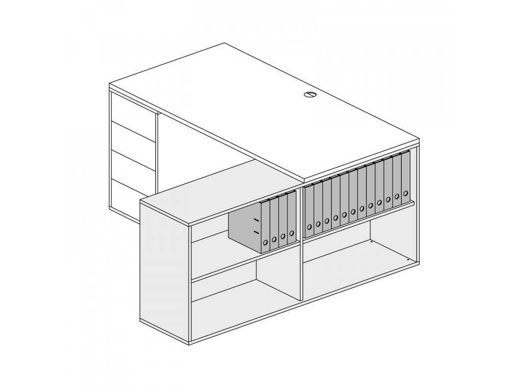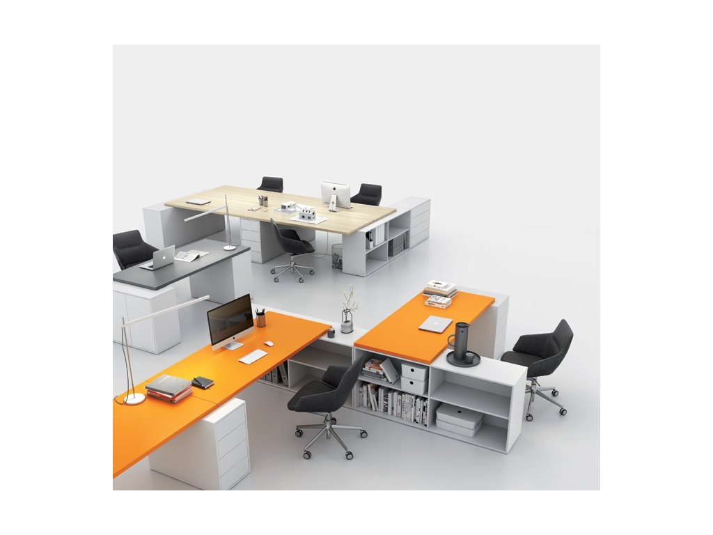 Nabízíme několik druhů skříněk. Otevřené skříňky mohou sloužit jako např. příruční knihovny. Skříňka se šuplíky na kratší straně zase funguje jako kontejner. Na výkresy a tiskoviny je vhodná skříňka s delšími šuplíky. Objemnější věci, které potřebujete schovat, najdou své místo ve skříňce s dvířky. Všechny skříňky jsou bez madel a otvírají se na dotek, takže působí kompaktně.