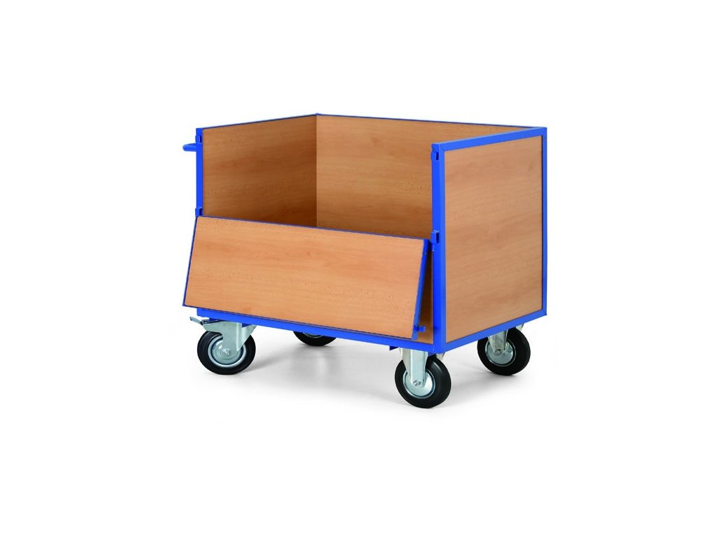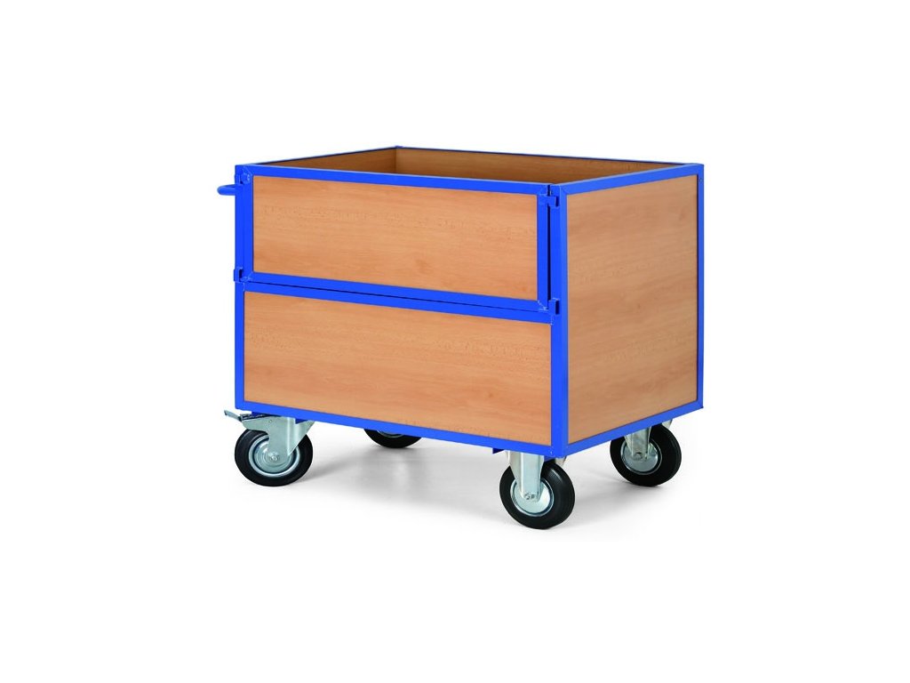 Masivní skříňové vozíky pro uložení většího množství drobného materiálu či součástek. Řešení se sklopnou přední stěnou umožňuje snadnější přístup k obsahu vozíku. U vozíků s víkem je víko vybaveno oky pro uzamknutí visacím zámkem, čímž je znemožněn přístup k obsahu vozíků pro nepovolané osoby či mimo pracovní dobu. Visací zámek není součástí dodávky. Horní víko je na otočných čepech pro snadné otevření. Kostra vozíků je celosvařená z ocelových profilů dokonalou svařovací technologií pod ochranou atmosférou. Dno je vsazeno do rámu z ocelových profilů, dřevěné výplně jsou vyrobeny z laminované dřevotřísky se vzorem světlý buk. Výplně z ocelového pletiva jsou z drátu o průměru 4 mm a s oky velikosti 50 x 50 mm. Kovové části jsou nakomaxitovány práškovým lakem RAL 5005. Kola jsou vybavena poklicí, která brání namotávání nití a provázků a také zanášení ložiska různými nečistotami, čímž se prodlužuje životnost kola. Kola jsou vždy dvě pevná a dvě otočná podle svislé osy. Jedno otočné kolečko vybaveno brzdou.