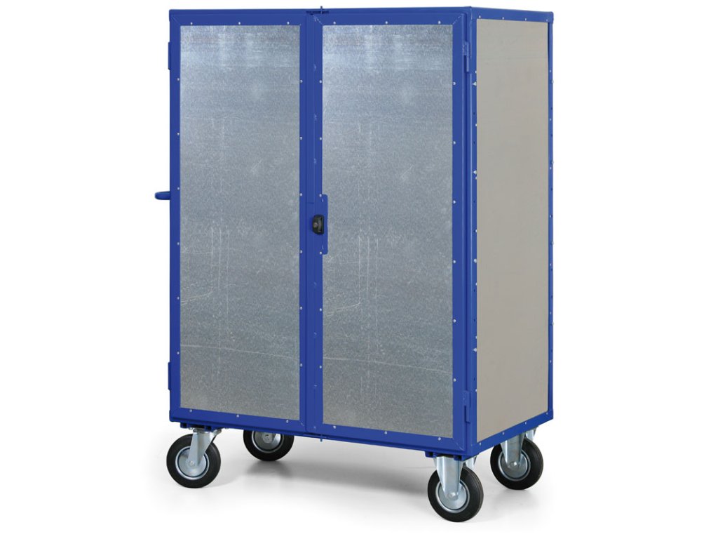 Tento vozík slouží k přepravě a uskladnění položek, které potřebujete chránit před odcizením. Velikost plošiny je 1200 x 800 mm a celková výška 1250 mm. Nosnost vozíku je 600 kg. Pevná svařovaná konstrukce zajišťuje stabilitu. Kostra vozíku je svařena z ocelových profilů. Stěny a horní víko jsou z pleiva s oky 50 x 50 mm, nebo ze zinkovaného plechu. Vozík je vybaven dvojitými křídlovými dveřmi s cylindrickým zámkem. Součástí dodávky jsou 2 klíče. Kola na vozíku jsou vybavena poklicí, která brání namotávání nití a provázků a také zanášení ložiska různými nečistotami, čímž se prodlužuje životnost, jsou o průměru 200 mm, dvě pevná a dvě otočná podle vlastní osy. Jedno otočné kolečko vybaveno brzdou. Kovové části jsou lakovány práškovým lakem RAL 5005. Dno je z laminované dřevotřísky, která je vsazena do ocelového rámu.Police z laminované dřevotřísky jsou přestavitelné po 10 cm.