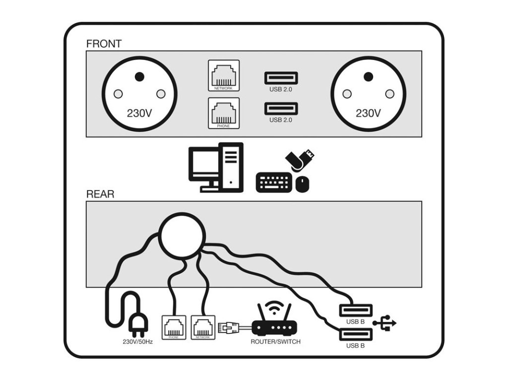 | Obsahuje | 2x zásuvka (francouzský typ) 110-240V 50/60Hz 10A, 2x port Ethernet (RJ-45) cat5E, 2x USB 2.0 port datový |
