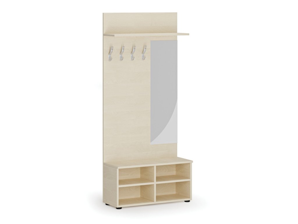 Věšáková stěna s botníkem a zrcadlem PRIMO, 4 háčky, police, bříza
