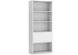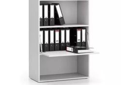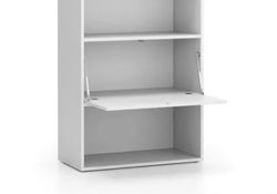 Kancelářský regál je místy doplněn i o boxy s vyklopným mechanismem dvířek, které se otevírají směrem dolů. Pokud byste výklopná dvířka, chtěli doplnit i do ostatních polic, můžete je snadno dokoupit i samostatně.