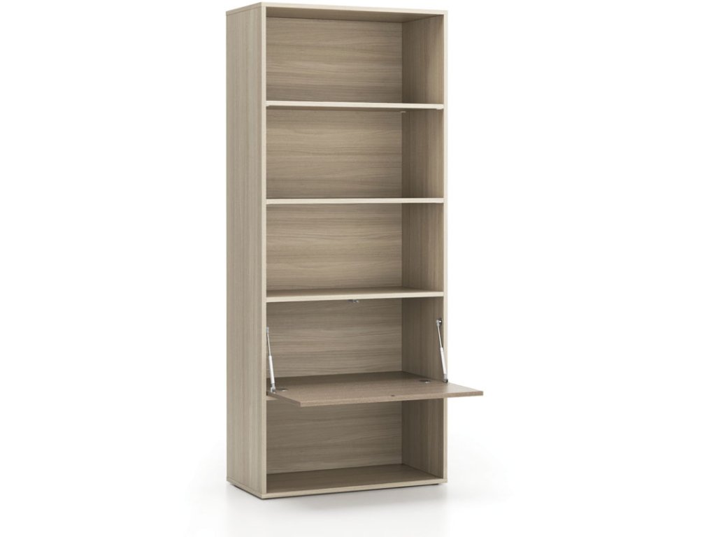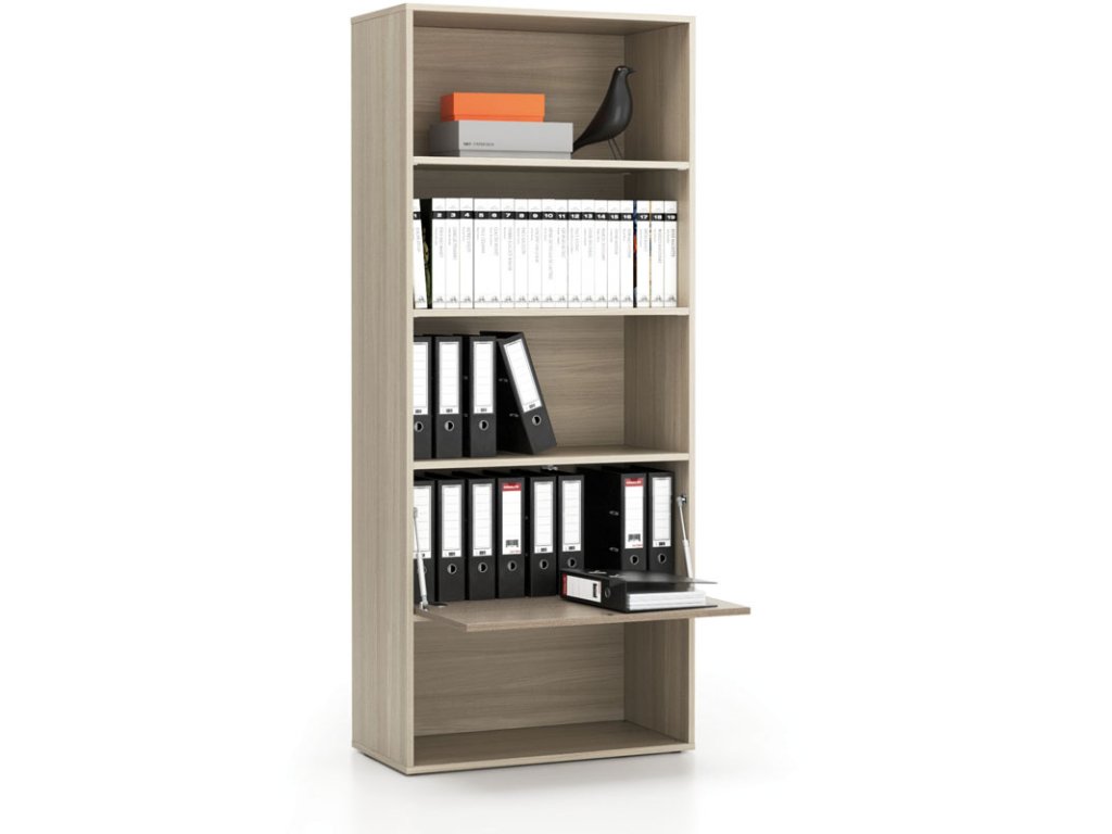 Kancelářský regál je místy doplněn i o boxy s vyklopným mechanismem dvířek, které se otevírají směrem dolů. Pokud byste výklopná dvířka, chtěli doplnit i do ostatních polic, můžete je snadno dokoupit i samostatně.