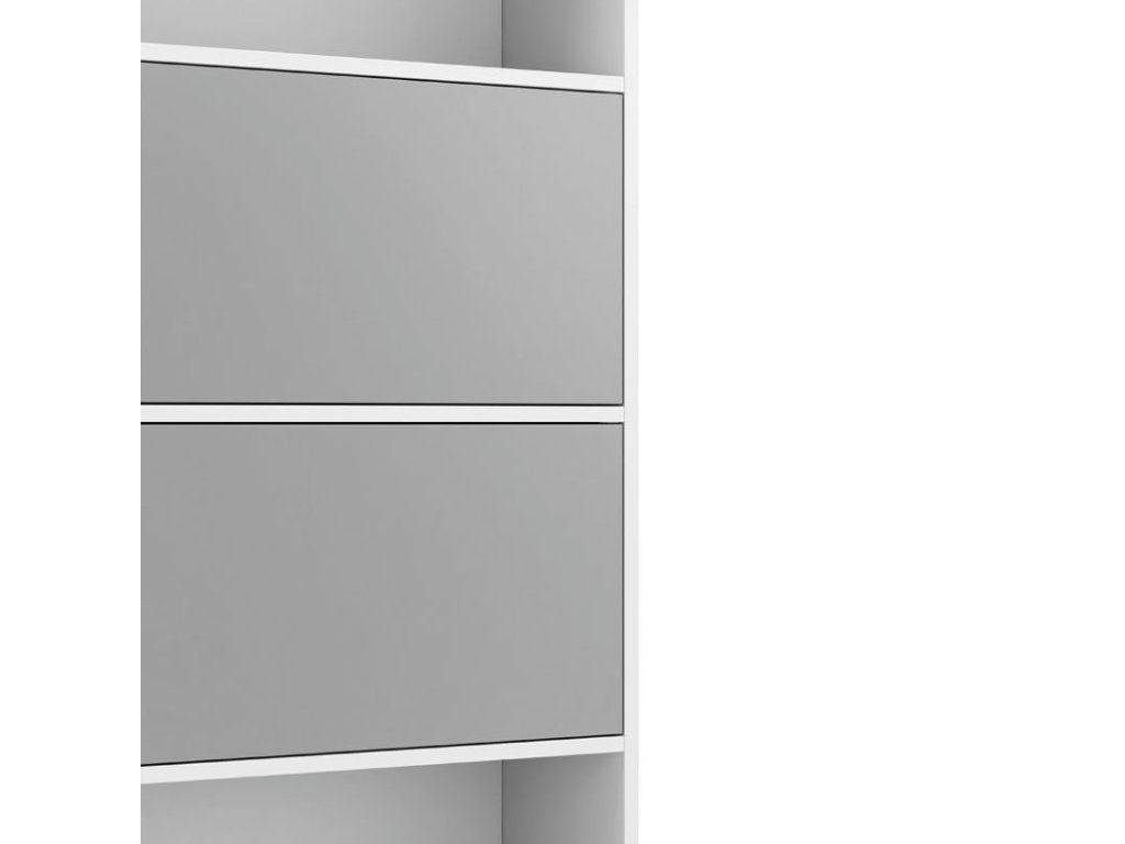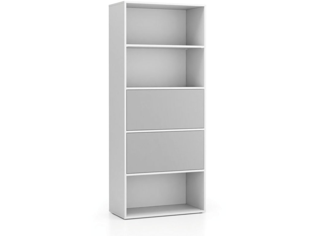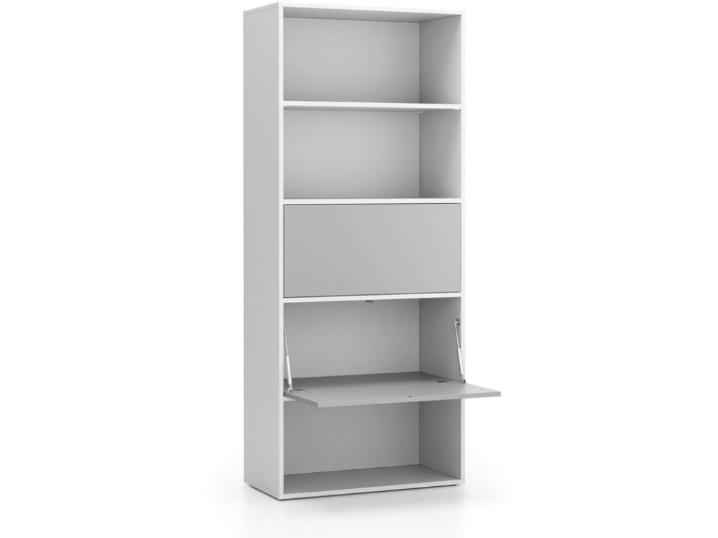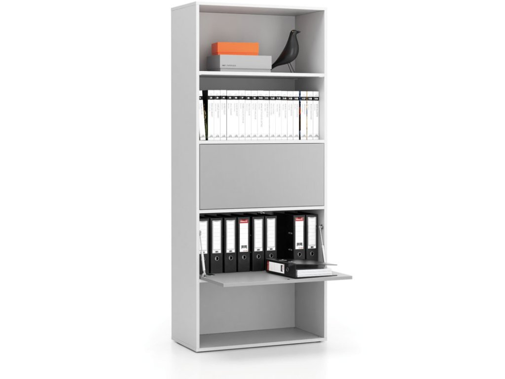 Kancelářský regál je místy doplněn i o boxy s vyklopným mechanismem dvířek, které se otevírají směrem dolů. Pokud byste výklopná dvířka, chtěli doplnit i do ostatních polic, můžete je snadno dokoupit i samostatně.