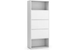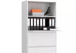 Kancelářský regál je místy doplněn i o boxy s vyklopným mechanismem dvířek, které se otevírají směrem dolů. Pokud byste výklopná dvířka, chtěli doplnit i do ostatních polic, můžete je snadno dokoupit i samostatně.