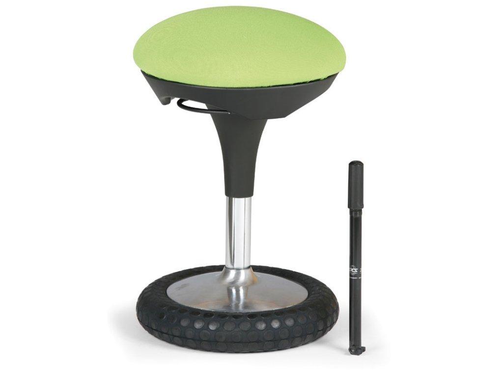 - podlahový talíř z leštěného kovu je opatřen pneumatikou, kterou je možno nahustit dle hmotnosti sedícího k dosažení příjemného balancování